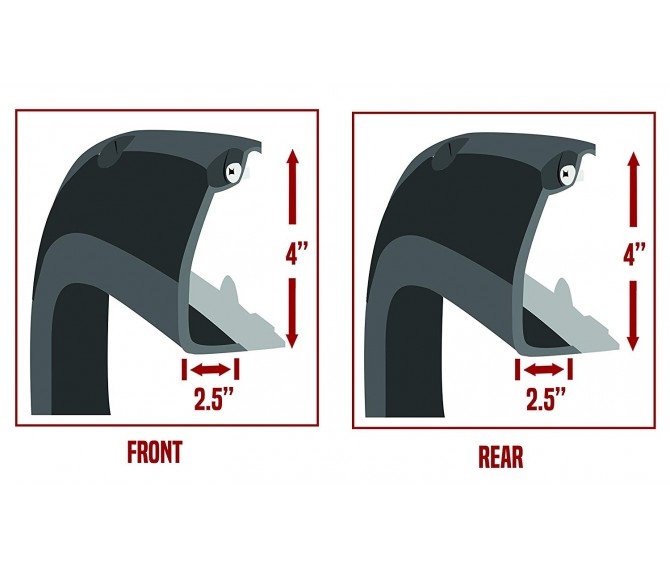- Flare Height: 4" in front and rear. Extra Tire Coverage: 2.5" in front and rear.